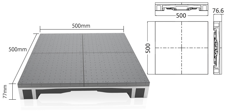 このLEDパネルは重量1トンまで耐えられるように設計されていますので、自動車の展示会などでも使用が可能です。ダンスフロアや、スポーツコート、ミュージアム、ショッピングセンターなどの道案内や、顔認識センサーを組み合わせたりなど、様々な用途でご利用いただけます。